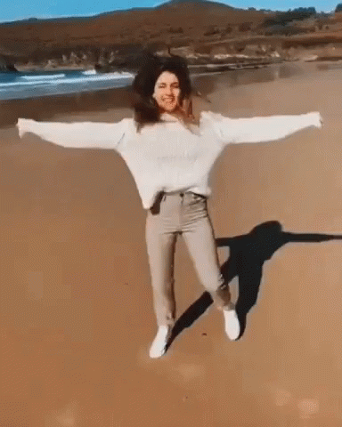 Aysabela Daniela joyfully jumping and running on a sandy beach, spreading her arms wide in happiness.