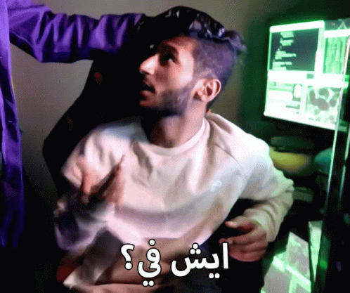 Azzam Shkles looks confused with the Arabic caption 'What's wrong?' during a gaming session.