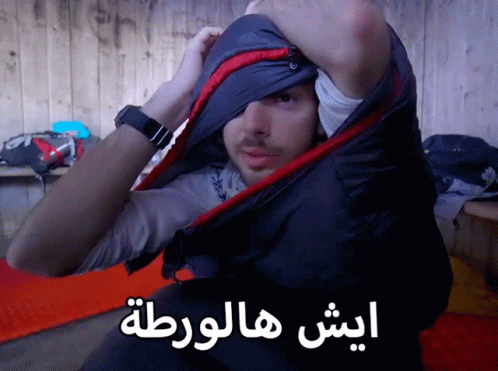 A man struggles to put on a sleeping bag, with Arabic text 'ايش هالورطة' (What a mess!) overlay.