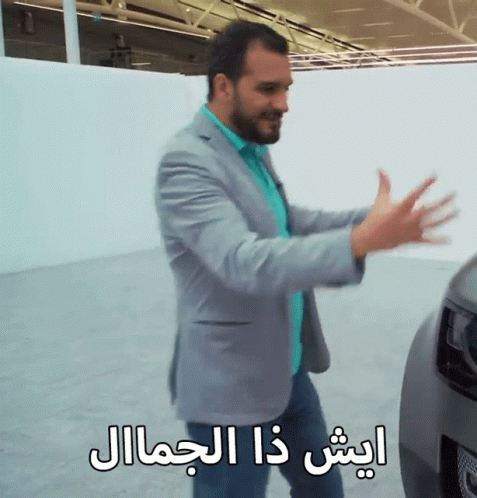 A man in a suit jacket admiring a car, exclaiming "What is this beauty?" with awe and excitement.