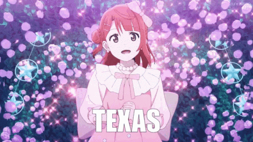a girl in a pink dress is standing in front of a purple background and the word texas is written on it .
