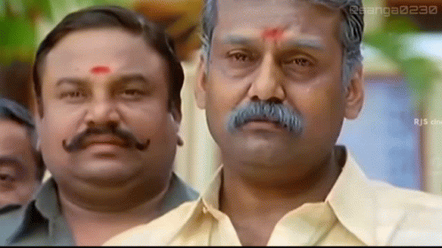 Two men, including Napoleon, with mustaches and traditional markings, perform a respectful 'Vanakkam' gesture in a scene from the Ayya Tamil movie.
