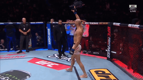a man in a boxing ring with ufc fight pass written on the fence