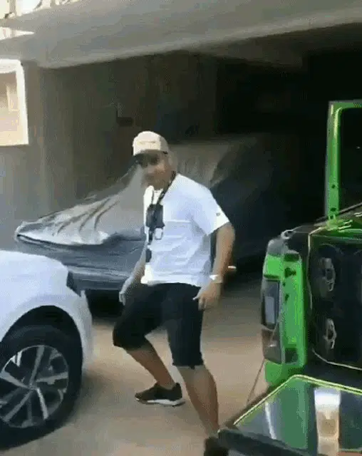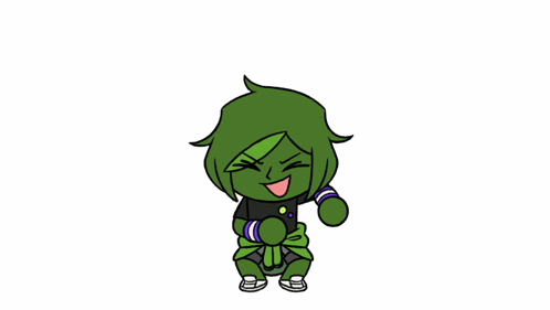 Azedo Torajo, a green-haired cartoon character, happily dances in a black shirt.