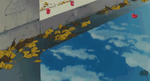 Animated scene featuring Azuki beans falling into water with ginkgo leaves and sky reflection.
