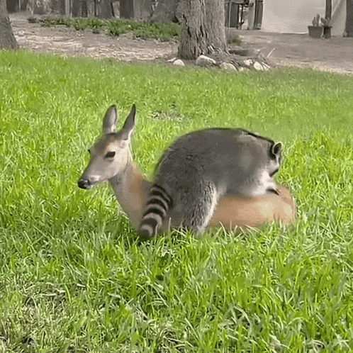A raccoon playfully interacts with a calm deer lying in a grassy field, climbing on its back and nuzzling.