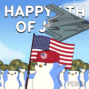 Cartoon penguins celebrate Happy 4th of July with an American flag and a B2 bomber flying overhead.