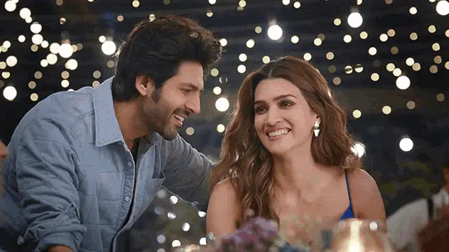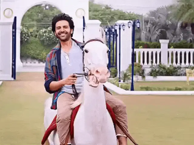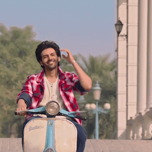 Kartik Aaryan smiles while riding a scooter and adjusting his hair, embodying a charming Bollywood vibe.