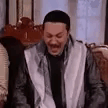 Moataz from the Syrian series Bab Al-Hara laughing heartily while sitting on a couch.