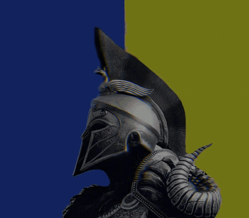 A striking statue of Ares by Baba G Itsmeares, illuminated by powerful lightning bolts against a split blue and yellow background.