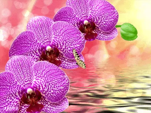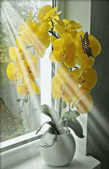 A beautiful butterfly rests on vibrant yellow orchids by a sunlit window.