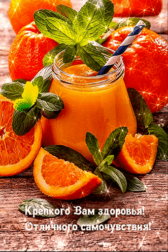 A vibrant image of orange juice with fresh oranges and mint, accompanied by a Russian wish for good health.