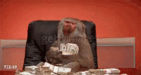 A baboon sits at a desk, holding stacks of money and surrounded by more cash.