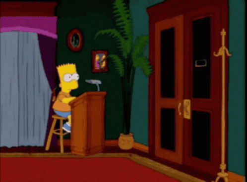 Bart Simpson at a podium as Grandpa Simpson enters and exits, saying 'Hello' and 'Goodbye' in Georgian.