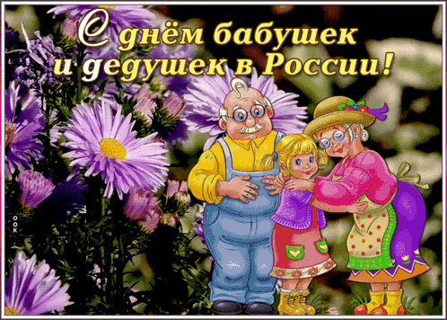 Cartoon of a happy grandmother, grandfather, and granddaughter celebrating Grandparents' Day in Russia, surrounded by purple flowers.