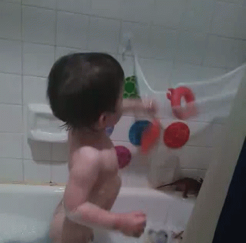 A cute baby enjoys bath time, playing with colorful toys in the tub.