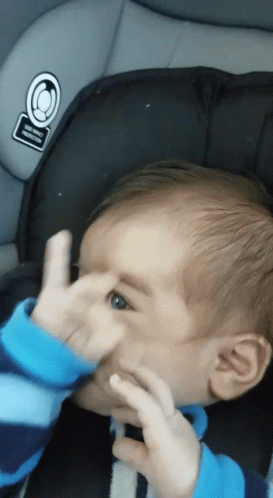 A cute baby is seen rubbing its eyes and looking sleepy while secured in a car seat.