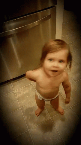 An adorable baby in a diaper stands on a tiled floor, playfully bobbing its head in a cute 'head bang'.