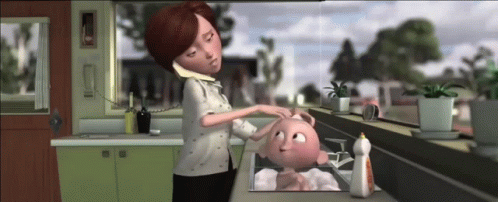 Elastigirl, Helen Parr, multitasking on the phone while washing baby Jack-Jack in the kitchen sink.