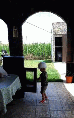 A little boy wearing a white hard hat walks from a patio towards a grassy field with a cornfield in the background.