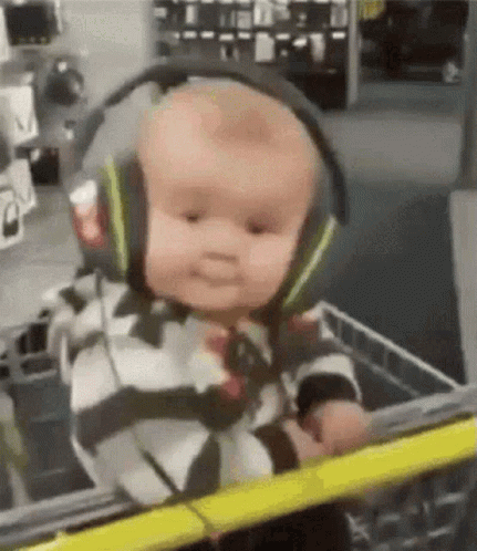 Adorable baby in a shopping cart happily listening to music with large headphones in a store.
