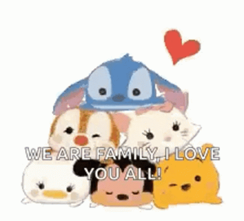 Disney Tsum Tsum characters including Winnie The Pooh, Stitch, and friends stack up, sharing a 'We Are Family' message.