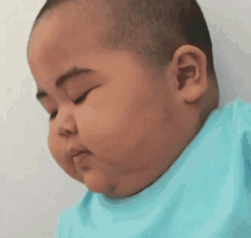 Baby Tatan makes a cute, sleepy, and funny face while wearing a blue shirt, looking adorable.
