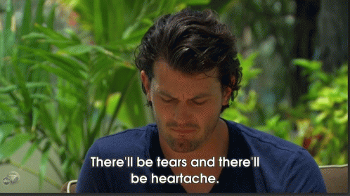 Brooks, from The Bachelorette, appears distraught, with the caption 'There'll be tears and there'll be heartache'.