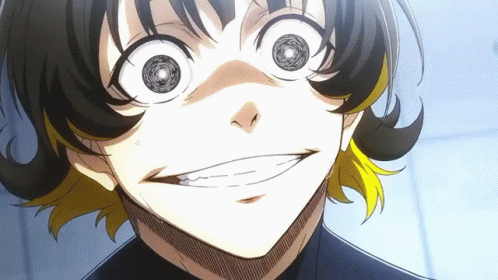 Bachira Meguru from Blue Lock shows intense, wide-eyed expressions on the soccer field, followed by cleats.