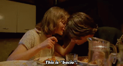 Chiara Caselli and Keanu Reeves share a passionate bacio (kiss) at a dinner table.