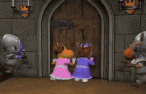 The Backyardigans characters Pablo and Tyrone in knight costumes, falling over in a castle setting.