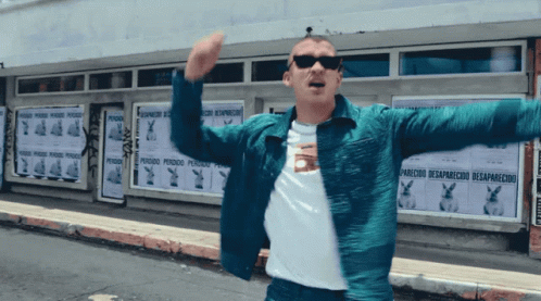 Bad Bunny Benito, the Puerto Rican rapper, in a blue jacket, making gestures on a street with 'perdido' posters.