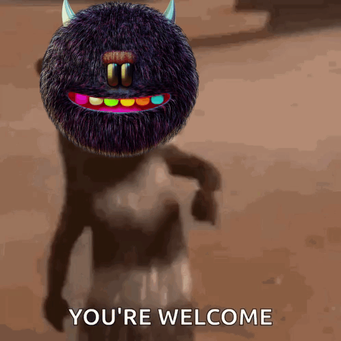 A furry monster with horns and colorful teeth says 'You're Welcome' in a playful manner.