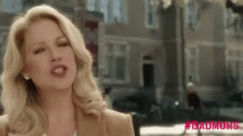 Christina Applegate from Bad Moms makes a funny face on a city street, wearing a tan jacket.