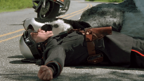 Jim Carrey as a police officer in Me, Myself & Irene, lying on the road with a dog after a tough situation.