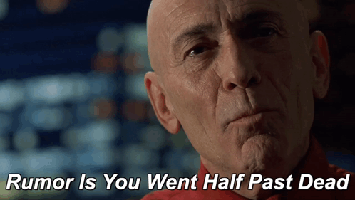 A bald man delivers the memorable line 'Rumor Is You Went Half Past Dead And Came Back' from the movie Half Past Dead.