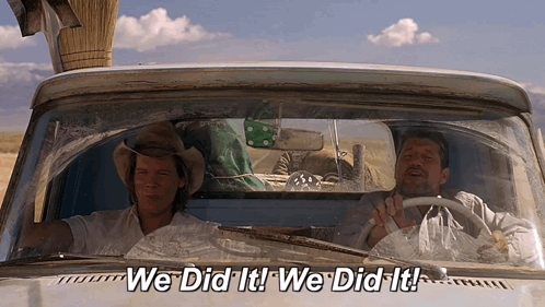 Val (Kevin Bacon) and Earl (Fred Ward) celebrate their victory in their truck, exclaiming 'We Did It!' from the movie Tremors.