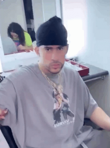 Badbunny, wearing a black beanie and graphic t-shirt, looks directly at the camera.
