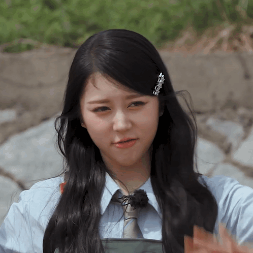 a girl with long black hair is wearing a tie and a hair clip
