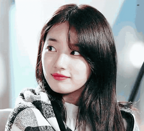 Bae Suzy smiles charmingly while wearing a plaid scarf, captured in a bright close-up shot.