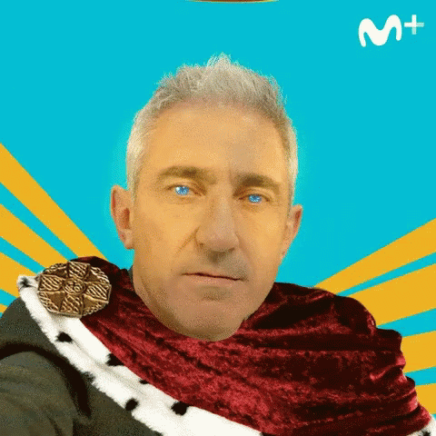 Baf King, a man with gray hair and blue eyes, wearing a royal robe and golden crown against a vibrant background.