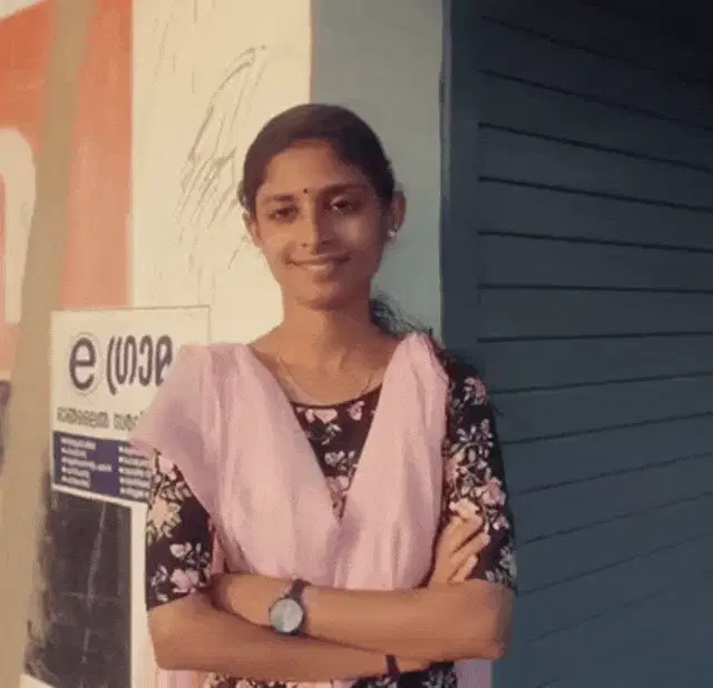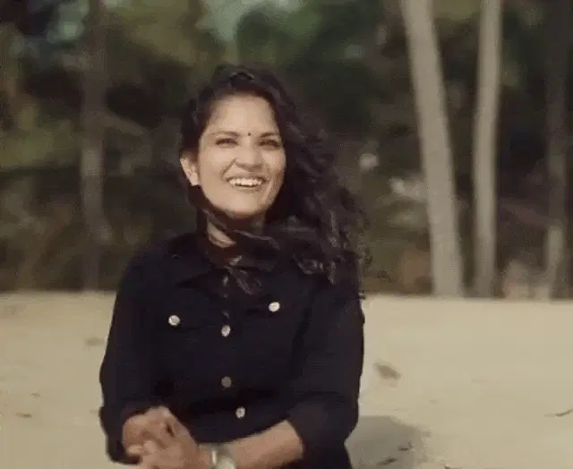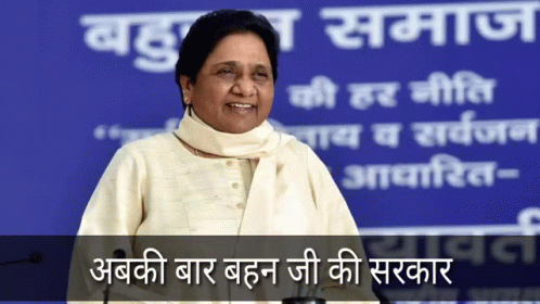 Mayawati, also known as Bahan Ji, smiling in front of a blue banner with the political slogan 'Abki baar Behan Ji ki Sarkar'.