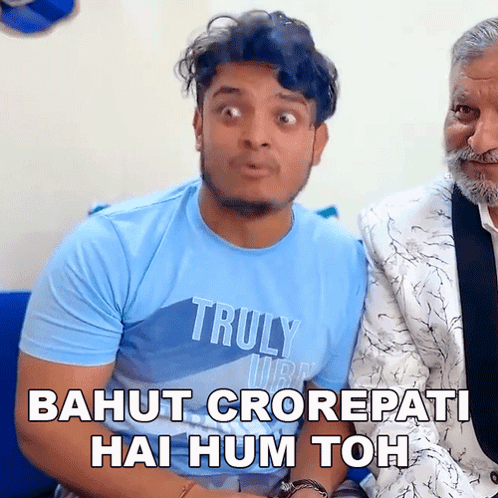 Prince Pathania humorously declares 'Bahut Crorepati Hai Hum Toh' while sitting with an older man.