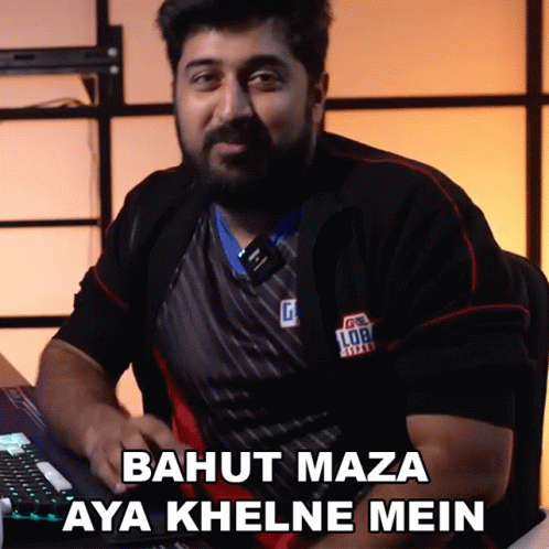 Rushindra Sinha expresses enjoyment after playing, wearing a black shirt with 'Global Esports' logo.