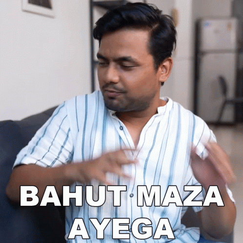 A man, Swamod Swatipramod, on a couch, expressing excitement with 'Bahut Maza Ayega' (It will be a lot of fun).