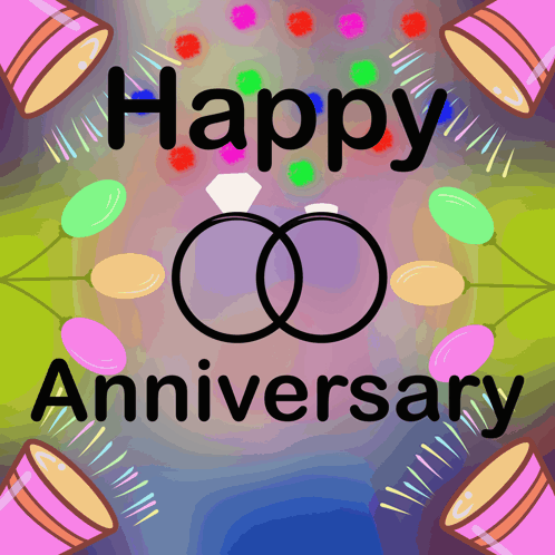 A vibrant greeting card featuring 'Happy Anniversary' text, interlocking rings, and festive decorations.