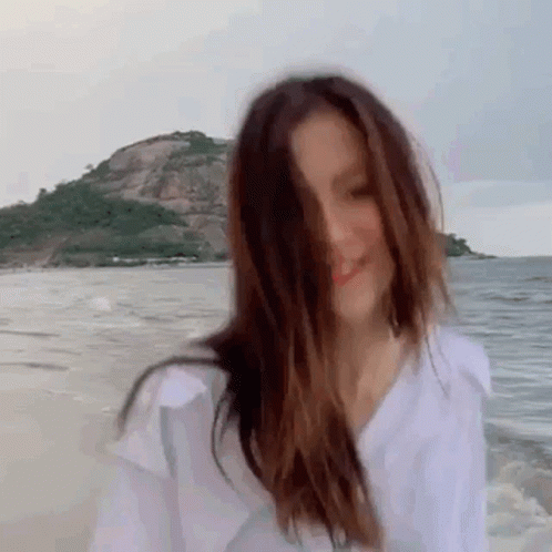 Baifern Pimchanok on a beach, smiling and making a playful pouting face with her hair blowing in the wind.