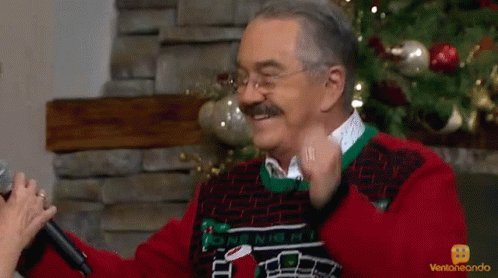Pedro Sola joyfully dances in a festive Christmas sweater, holding a microphone.