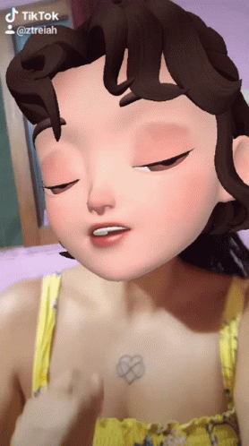 A person uses a 3D avatar filter on TikTok, moving their head and mouth as if singing or dancing, with a heart tattoo visible.