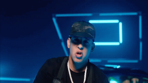 Daddy Yankee dancing energetically in a blue-lit setting, wearing a hat and silver chains.
